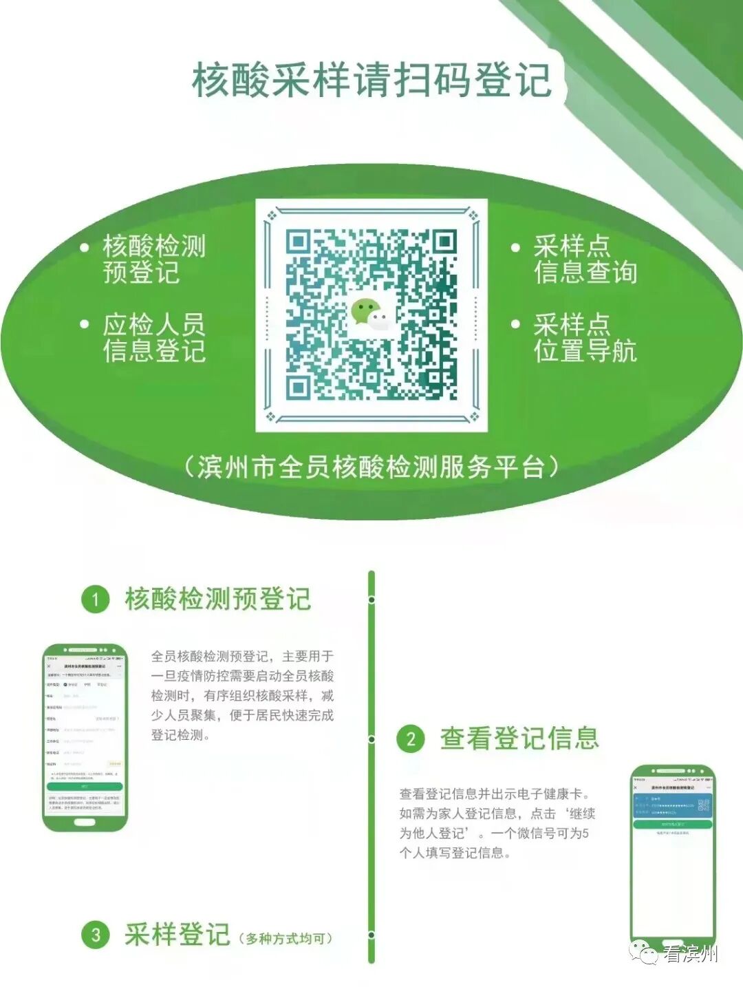 2.本輪核酸檢測(cè)繼續(xù)采用線上登記、線下檢測(cè)的方式。廣大市民朋友提前登陸濱州衛(wèi)生健康(后附二維碼),按照步驟登記形成采樣碼并截圖保存于手機(jī)相冊(cè),采樣時(shí)出示。沒(méi)有智能手機(jī)或不會(huì)操作微信的居民可由家人或現(xiàn)場(chǎng)工作人員為其登記。